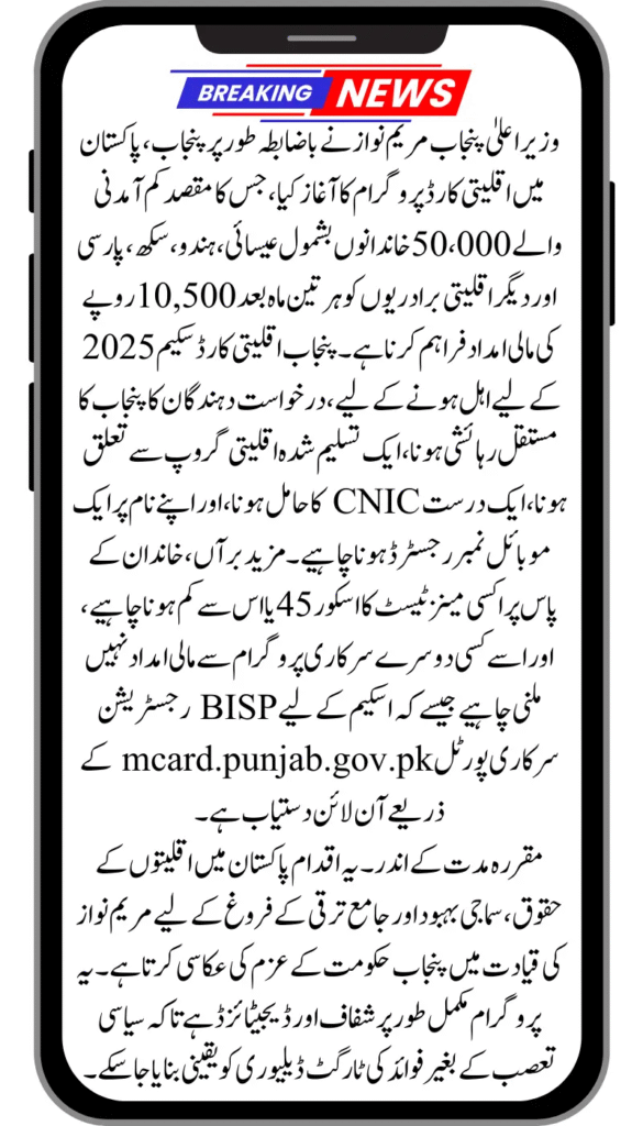 In 2025, the CM Punjab Minority Card, launched by Maryam Nawaz, provides PKR 10,500 every quarter for needy non‑Muslim minority families in Punjab; to be eligible you must be a head of household who is a permanent resident of Punjab, belong to a minority community hold a valid CNIC, have a mobile number registered in your own name, have a Proxy Means Test (PMT) score of 45 or less, and not already be receiving financial assistance from other welfare schemes such as BISP or PSPA; registration is via the online portal mcard.punjab.gov.pk during the announced window.